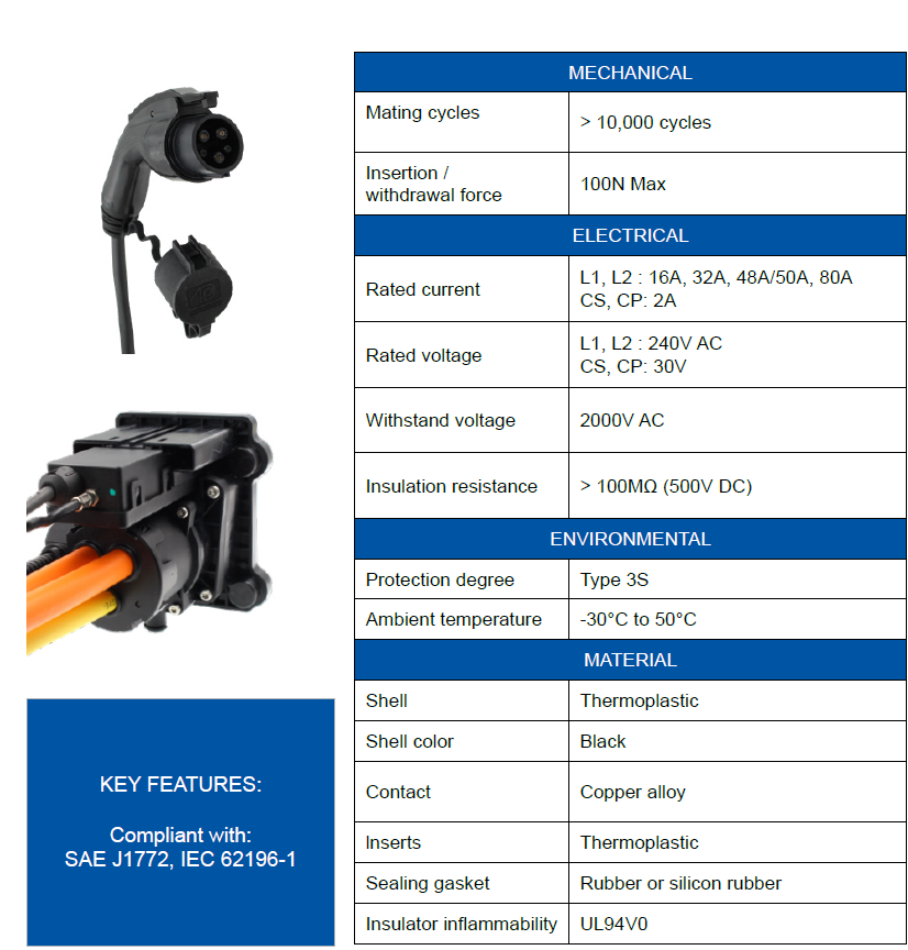 32A/50A/80A, 1 OR 3 PHASE, SAE TYPE 1 AC CONNECTOR FOR VEHICLE, POTTED VERSION
